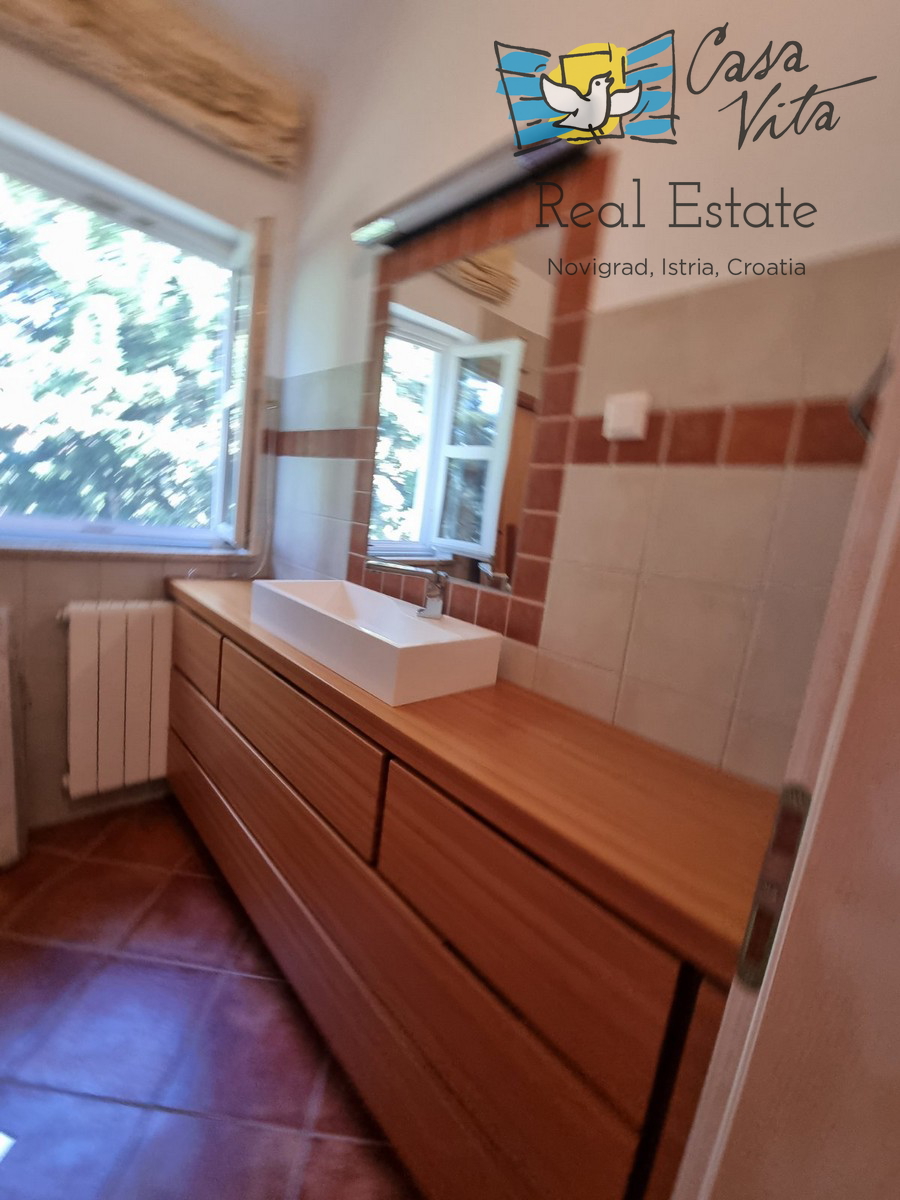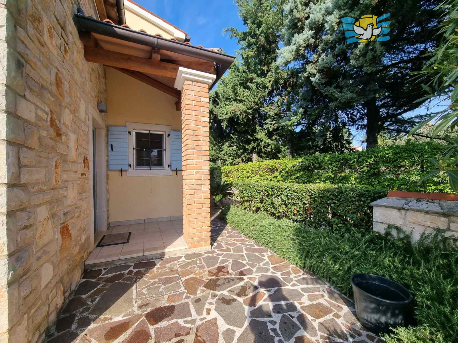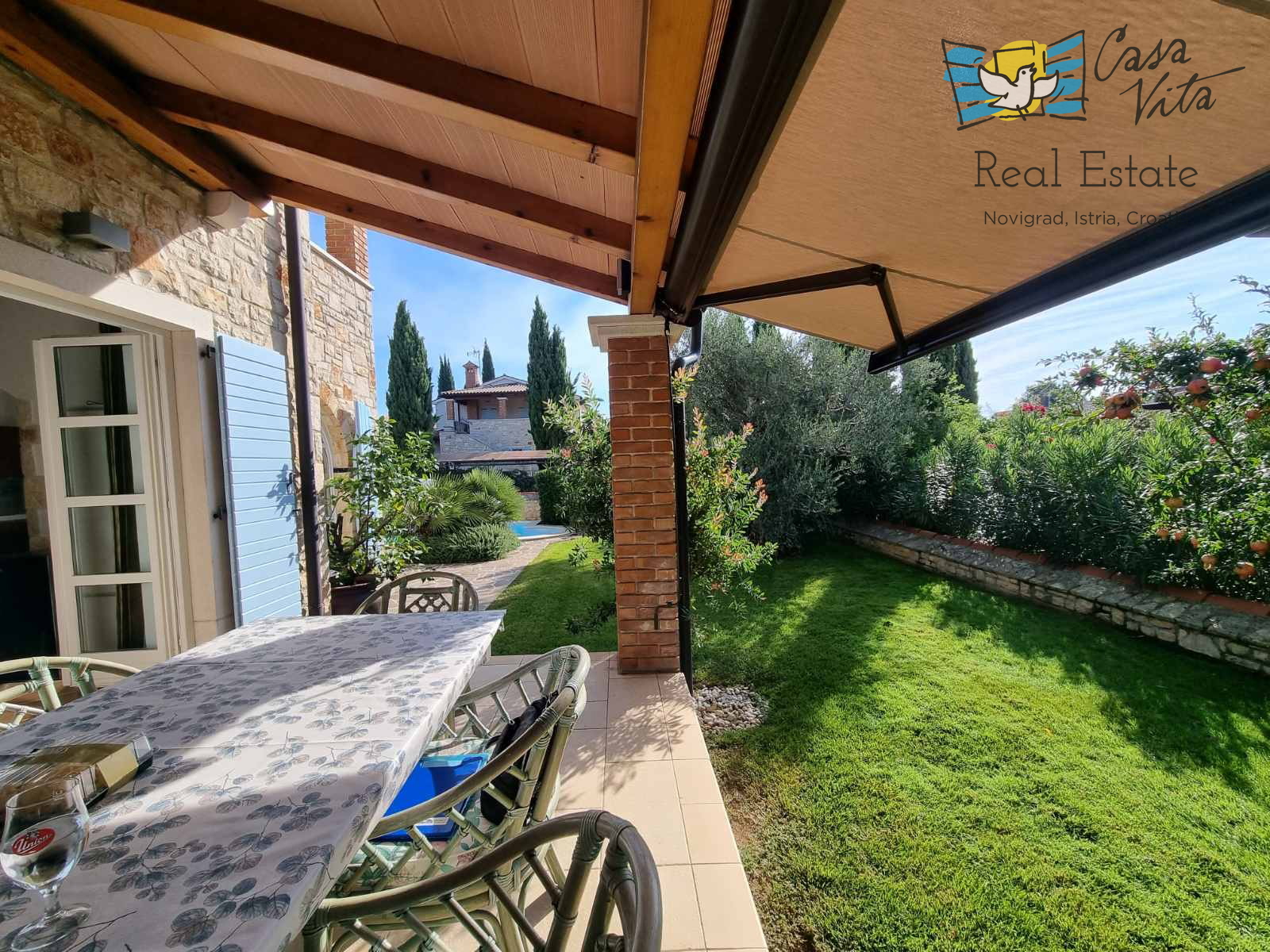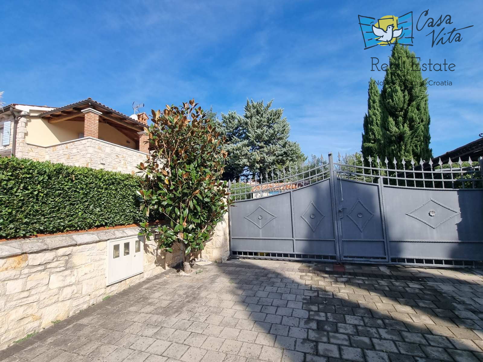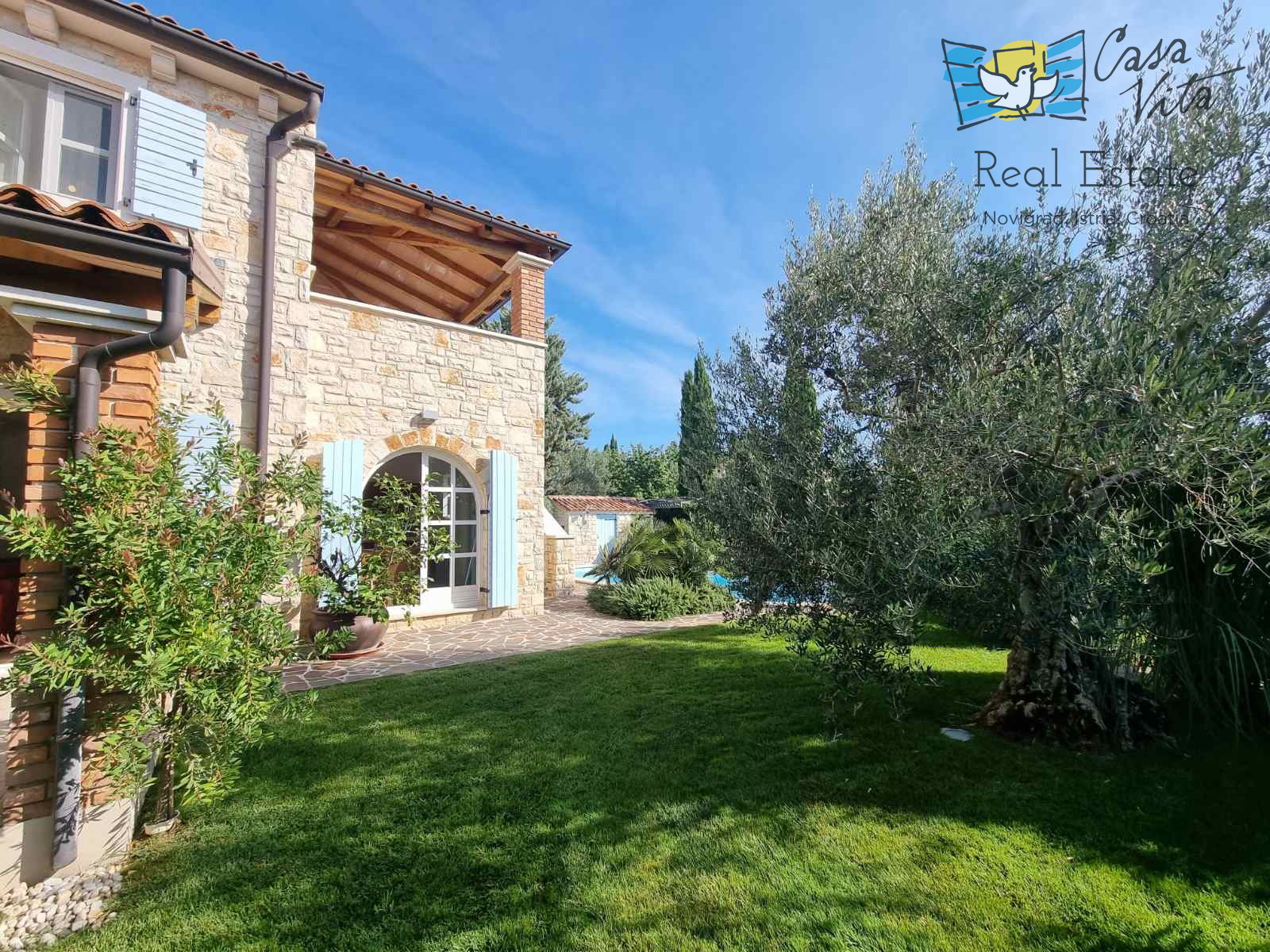 Prodaje se prekrasna dvojna kuća nalazi se na mirnoj lokaciji nedaleko od Poreča i svega 1 km od mora. Sagrađena je 2006. godine, a vlasnici su je renovirali 2021. godine, te ju kontinuirano održavaju. Kupili su je i koristili isključivo za svoje potrebe, kuća nije nikada iznajmljivana! Ukupno ima 155,55 m2 sa terasama (135 m2 zatvorenog prostora), na parceli od 367 m2. Vrta ima 200 m2. Kuća se sastoji od prizemlja i kata, mediteransko-rustikalnog je stila. U prizemlju se nalaze hodnik, spavaća soba, kupaona, veliki dnevni boravak sa kaminom i kuhinja sa blagovanom. Iz dnevnog boravka i kuhinje izlazi se na natrkivenu terasu gdje se nalazi još jedan kamin i stol za ručavanje, te u vrt. Na katu se nalaze još dvije spavaće sobe svaka sa svojim kupatilom, koje dijele prostranu natkrivenu terasu. Terasa je vanjskim stubištem povezana sa vrtom. Vrt je prekrasno uređen sa mediteranskim biljkama, starom maslinom, uređenim travnjakom, te bazenom od 30 m2. Uz bazen je napravljena mala kamena vrtna kućica od 7 m2 gdje je predviđeno sve za saunu ili može služiti kao spremište. Uz bazen i kućicu se nalazi vanjski tuš. Kuća ima 2 parkirna mjesta. Cijeli vrt je zatvoren zidom, zelenilom ili metalnom ogradom. U stražnjem dijelu kuće, blizu bazena, nalazi se spremište/kotlovnica i ljetna kuhinja. Kuća se prodaje sa namještajem koji je izrađen za cijelu kuću po mjeri. Grijanje je regulirano centralno na lož ulje. Pokretna klima je instalirana samo u jednoj spavaćoj sobi. Instaliran je i alarm te video kamere. Kuća može biti odmah useljiva!