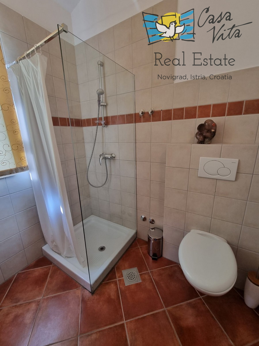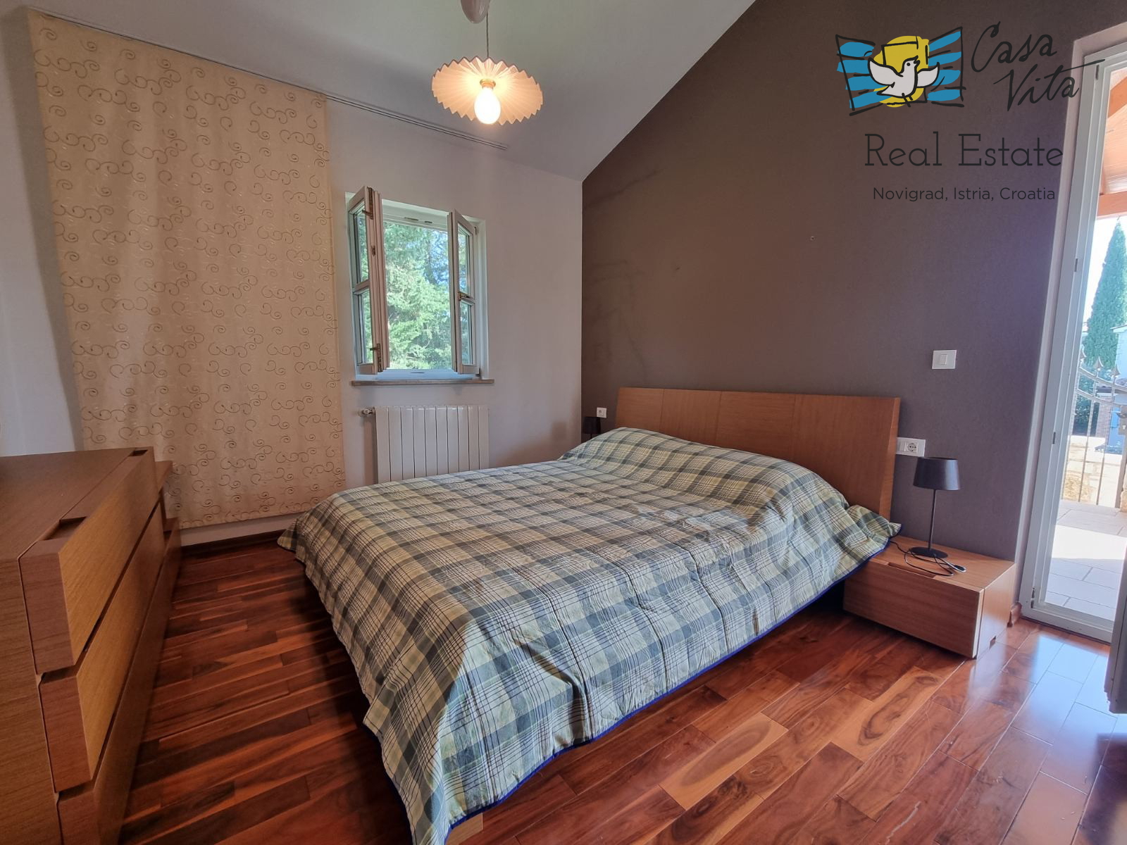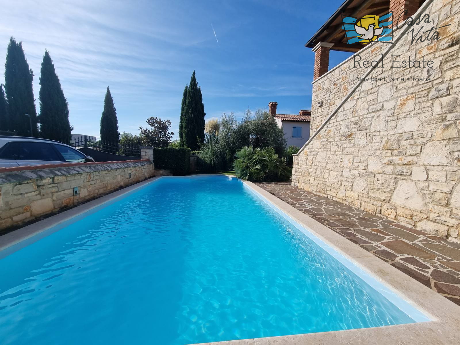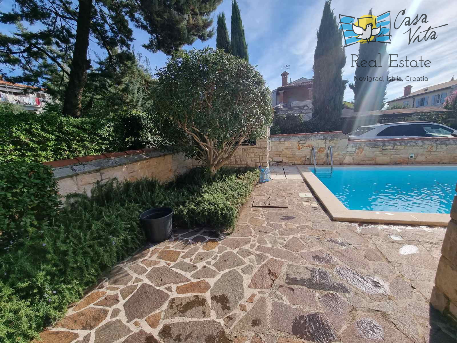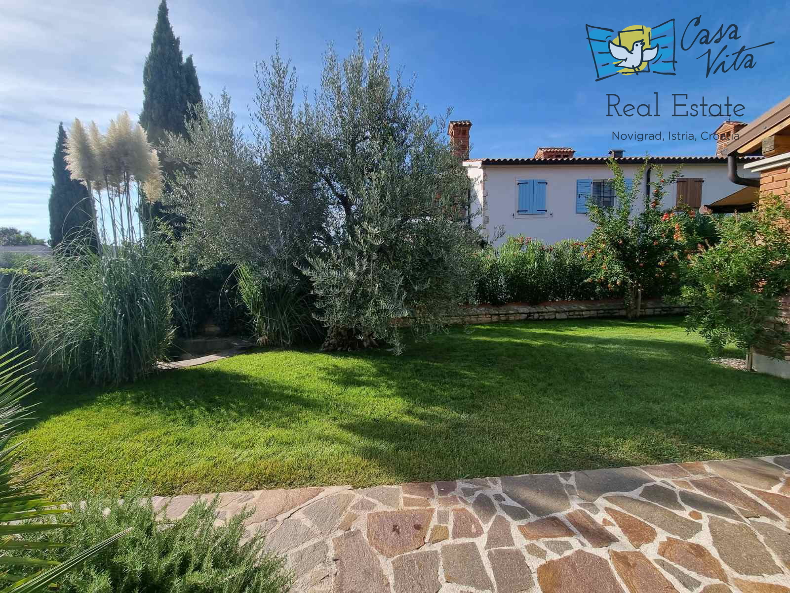 Prodaje se prekrasna dvojna kuća nalazi se na mirnoj lokaciji nedaleko od Poreča i svega 1 km od mora. Sagrađena je 2006. godine, a vlasnici su je renovirali 2021. godine, te ju kontinuirano održavaju. Kupili su je i koristili isključivo za svoje potrebe, kuća nije nikada iznajmljivana! Ukupno ima 155,55 m2 sa terasama (135 m2 zatvorenog prostora), na parceli od 367 m2. Vrta ima 200 m2. Kuća se sastoji od prizemlja i kata, mediteransko-rustikalnog je stila. U prizemlju se nalaze hodnik, spavaća soba, kupaona, veliki dnevni boravak sa kaminom i kuhinja sa blagovanom. Iz dnevnog boravka i kuhinje izlazi se na natrkivenu terasu gdje se nalazi još jedan kamin i stol za ručavanje, te u vrt. Na katu se nalaze još dvije spavaće sobe svaka sa svojim kupatilom, koje dijele prostranu natkrivenu terasu. Terasa je vanjskim stubištem povezana sa vrtom. Vrt je prekrasno uređen sa mediteranskim biljkama, starom maslinom, uređenim travnjakom, te bazenom od 30 m2. Uz bazen je napravljena mala kamena vrtna kućica od 7 m2 gdje je predviđeno sve za saunu ili može služiti kao spremište. Uz bazen i kućicu se nalazi vanjski tuš. Kuća ima 2 parkirna mjesta. Cijeli vrt je zatvoren zidom, zelenilom ili metalnom ogradom. U stražnjem dijelu kuće, blizu bazena, nalazi se spremište/kotlovnica i ljetna kuhinja. Kuća se prodaje sa namještajem koji je izrađen za cijelu kuću po mjeri. Grijanje je regulirano centralno na lož ulje. Pokretna klima je instalirana samo u jednoj spavaćoj sobi. Instaliran je i alarm te video kamere. Kuća može biti odmah useljiva!