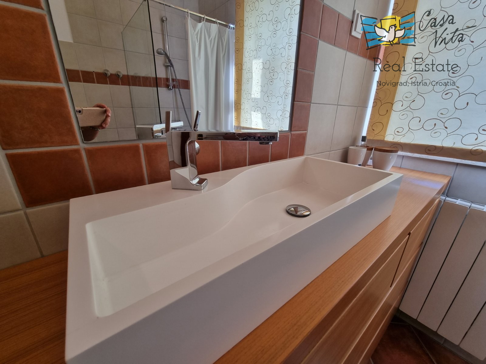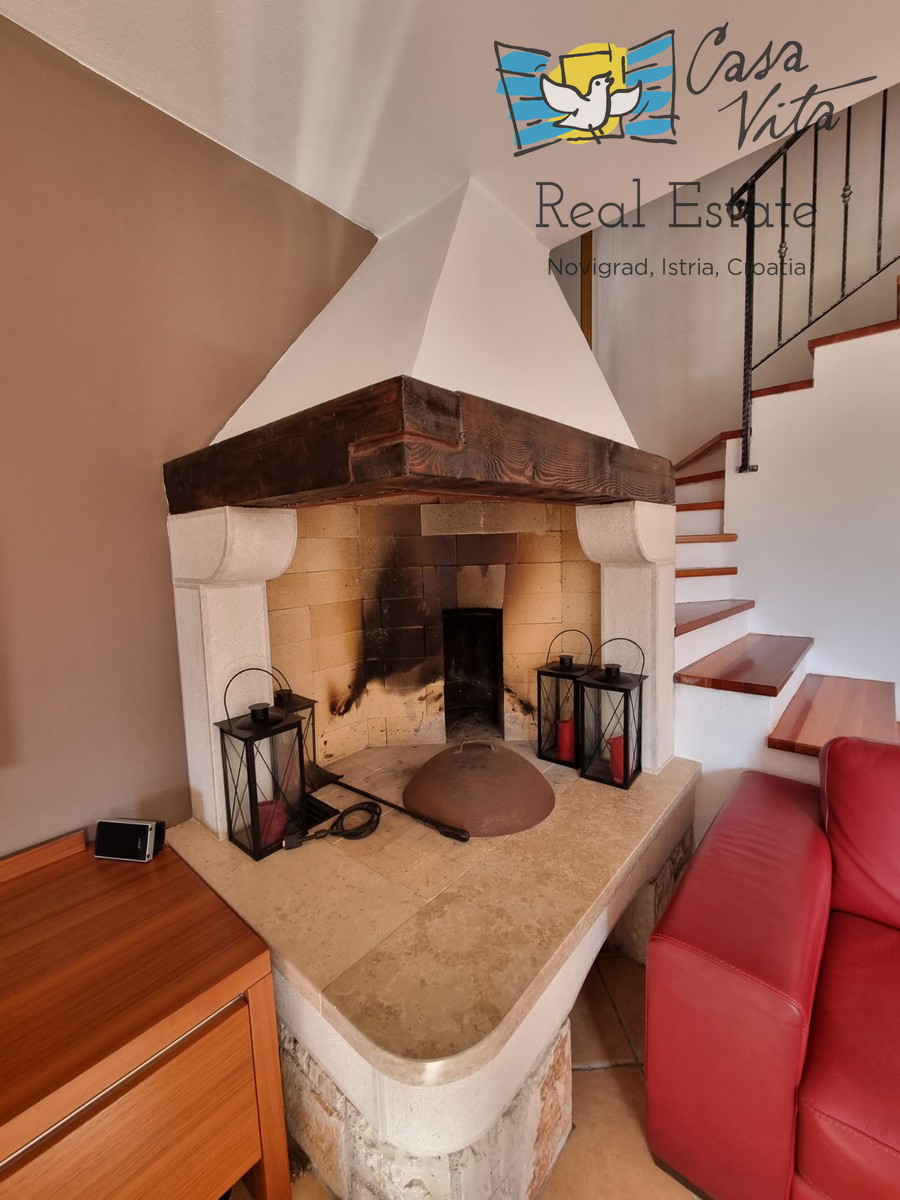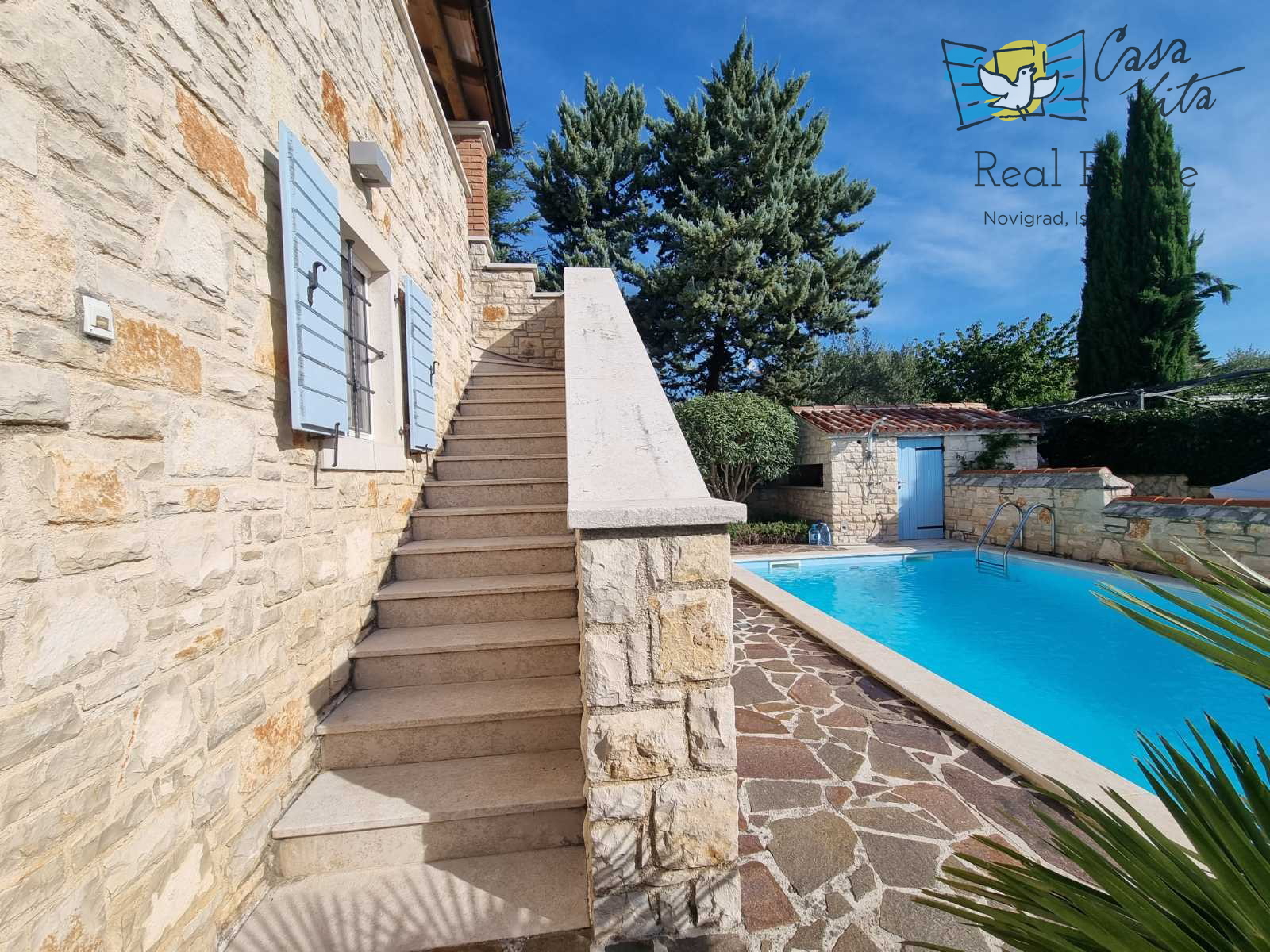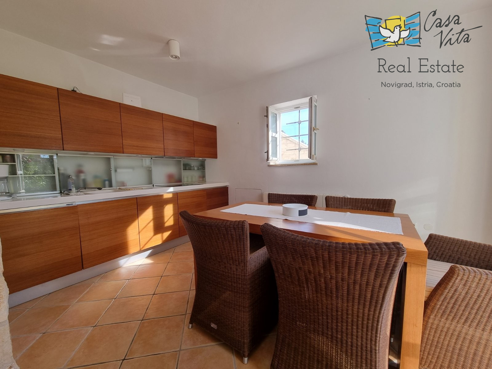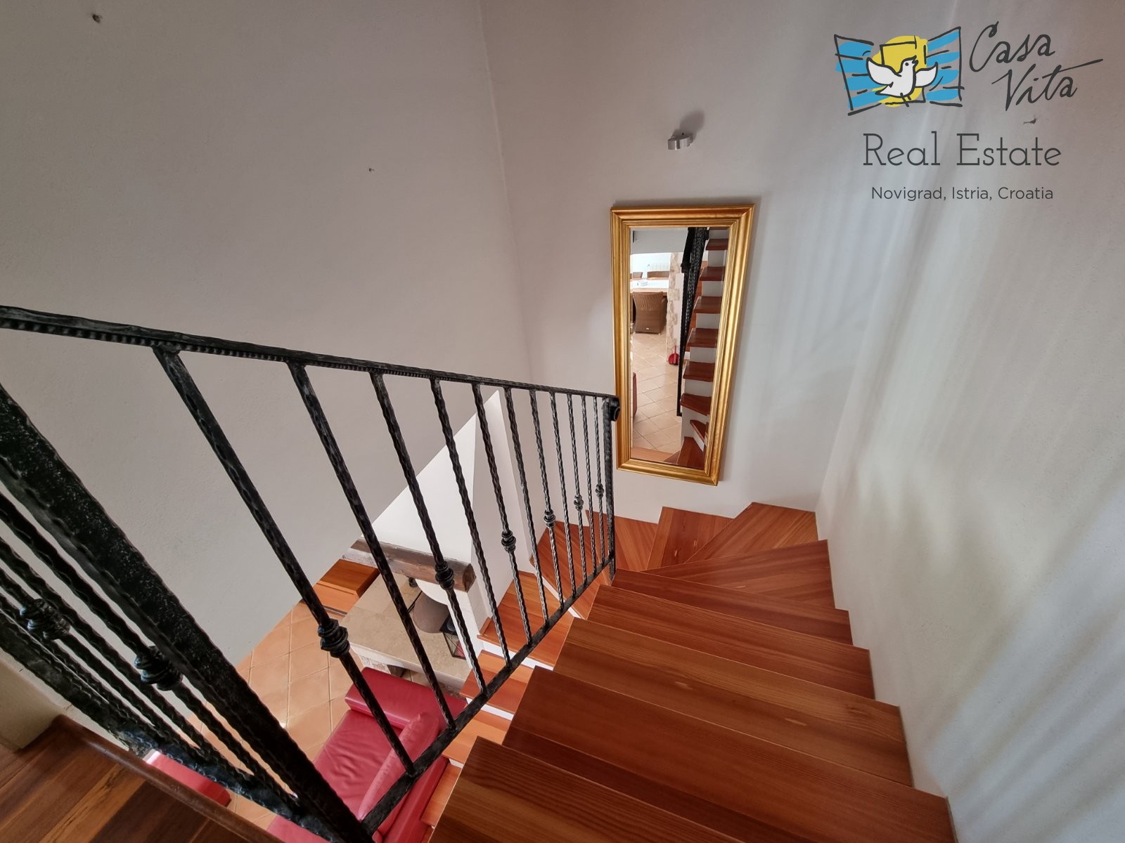 Prodaje se prekrasna dvojna kuća nalazi se na mirnoj lokaciji nedaleko od Poreča i svega 1 km od mora. Sagrađena je 2006. godine, a vlasnici su je renovirali 2021. godine, te ju kontinuirano održavaju. Kupili su je i koristili isključivo za svoje potrebe, kuća nije nikada iznajmljivana! Ukupno ima 155,55 m2 sa terasama (135 m2 zatvorenog prostora), na parceli od 367 m2. Vrta ima 200 m2. Kuća se sastoji od prizemlja i kata, mediteransko-rustikalnog je stila. U prizemlju se nalaze hodnik, spavaća soba, kupaona, veliki dnevni boravak sa kaminom i kuhinja sa blagovanom. Iz dnevnog boravka i kuhinje izlazi se na natrkivenu terasu gdje se nalazi još jedan kamin i stol za ručavanje, te u vrt. Na katu se nalaze još dvije spavaće sobe svaka sa svojim kupatilom, koje dijele prostranu natkrivenu terasu. Terasa je vanjskim stubištem povezana sa vrtom. Vrt je prekrasno uređen sa mediteranskim biljkama, starom maslinom, uređenim travnjakom, te bazenom od 30 m2. Uz bazen je napravljena mala kamena vrtna kućica od 7 m2 gdje je predviđeno sve za saunu ili može služiti kao spremište. Uz bazen i kućicu se nalazi vanjski tuš. Kuća ima 2 parkirna mjesta. Cijeli vrt je zatvoren zidom, zelenilom ili metalnom ogradom. U stražnjem dijelu kuće, blizu bazena, nalazi se spremište/kotlovnica i ljetna kuhinja. Kuća se prodaje sa namještajem koji je izrađen za cijelu kuću po mjeri. Grijanje je regulirano centralno na lož ulje. Pokretna klima je instalirana samo u jednoj spavaćoj sobi. Instaliran je i alarm te video kamere. Kuća može biti odmah useljiva!