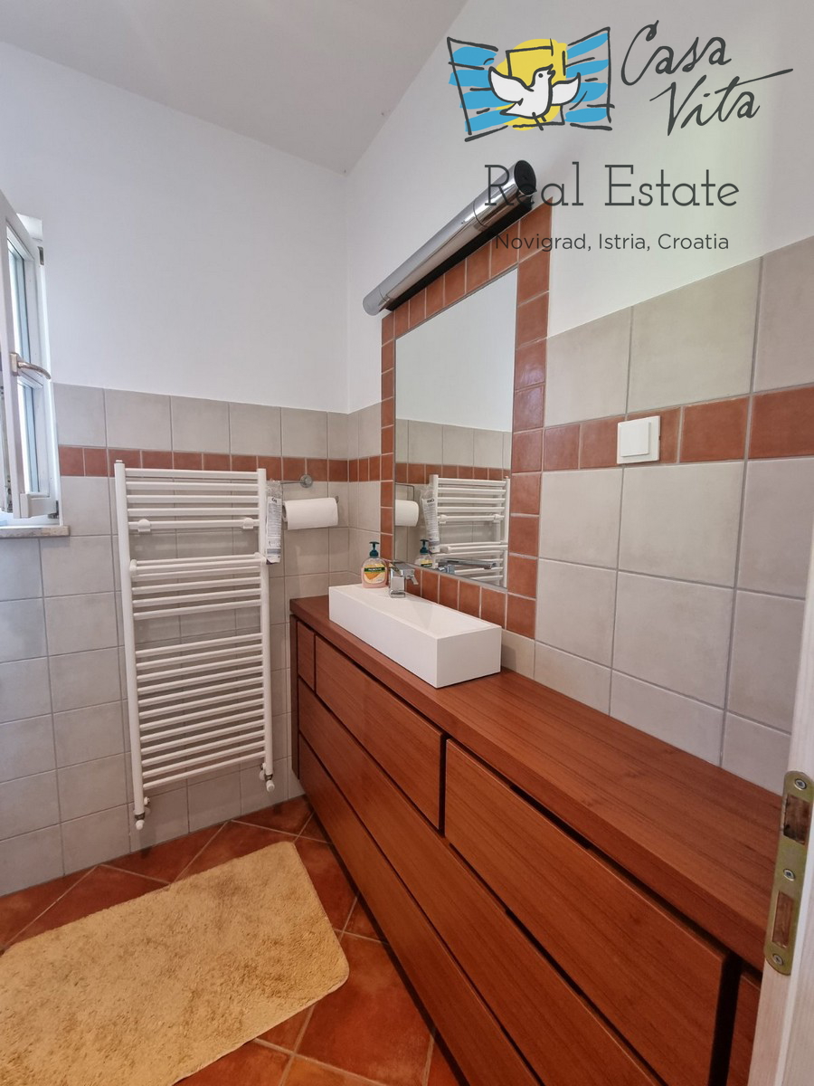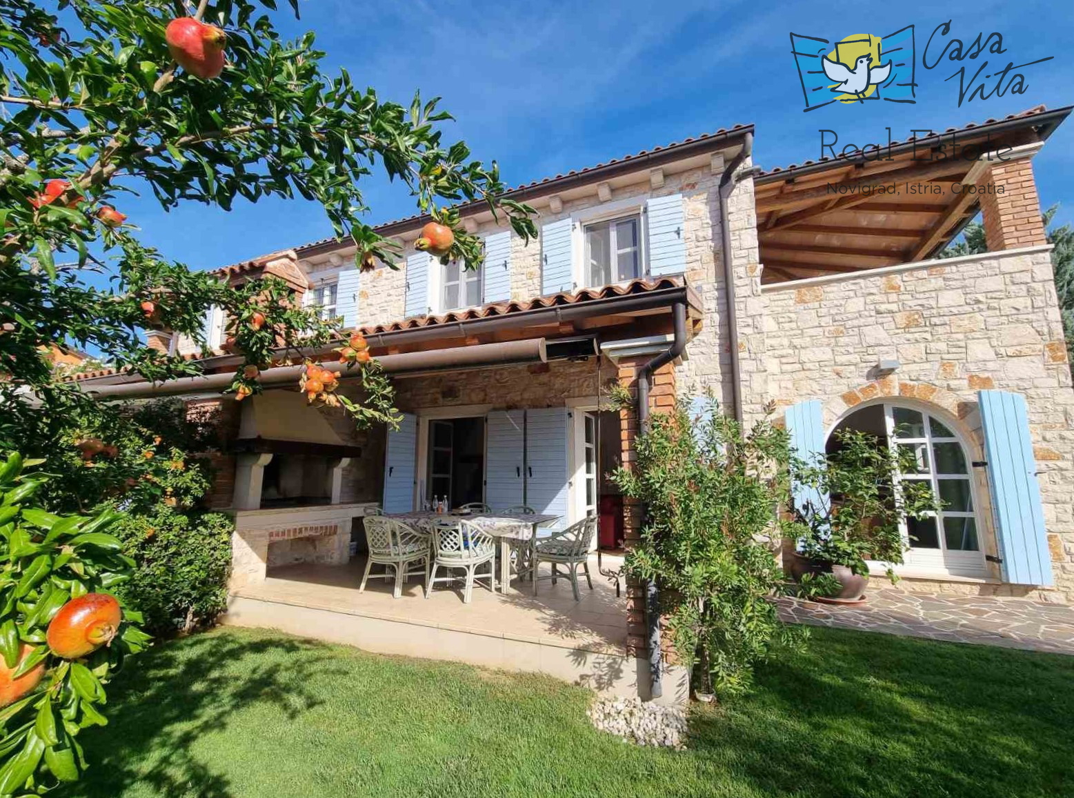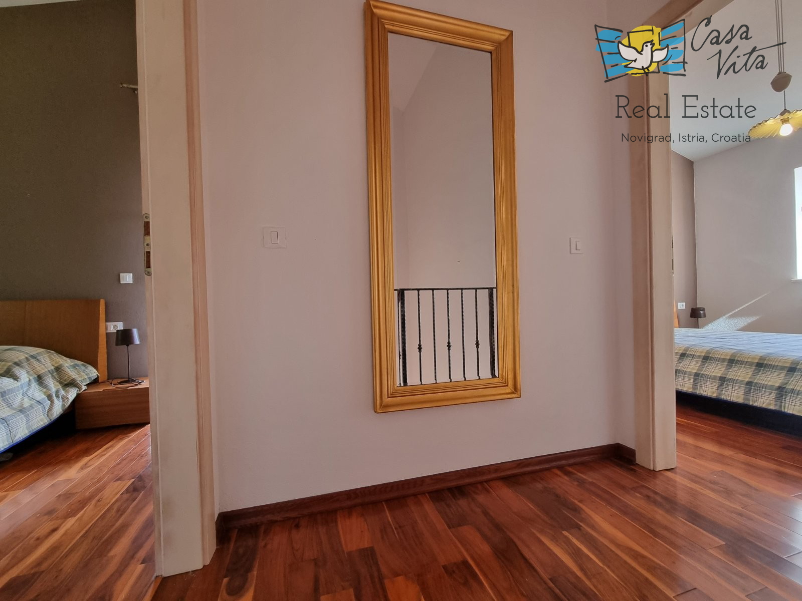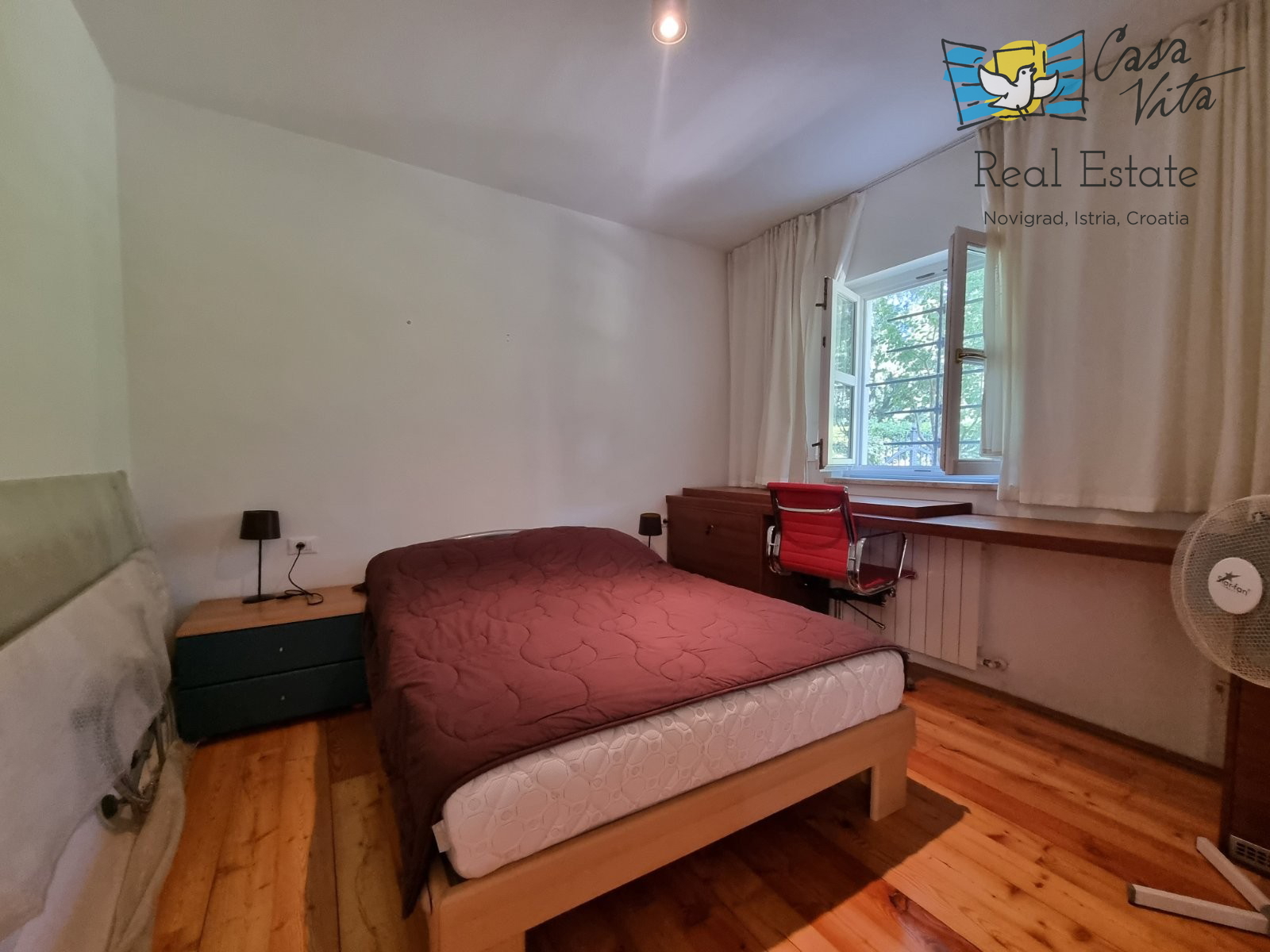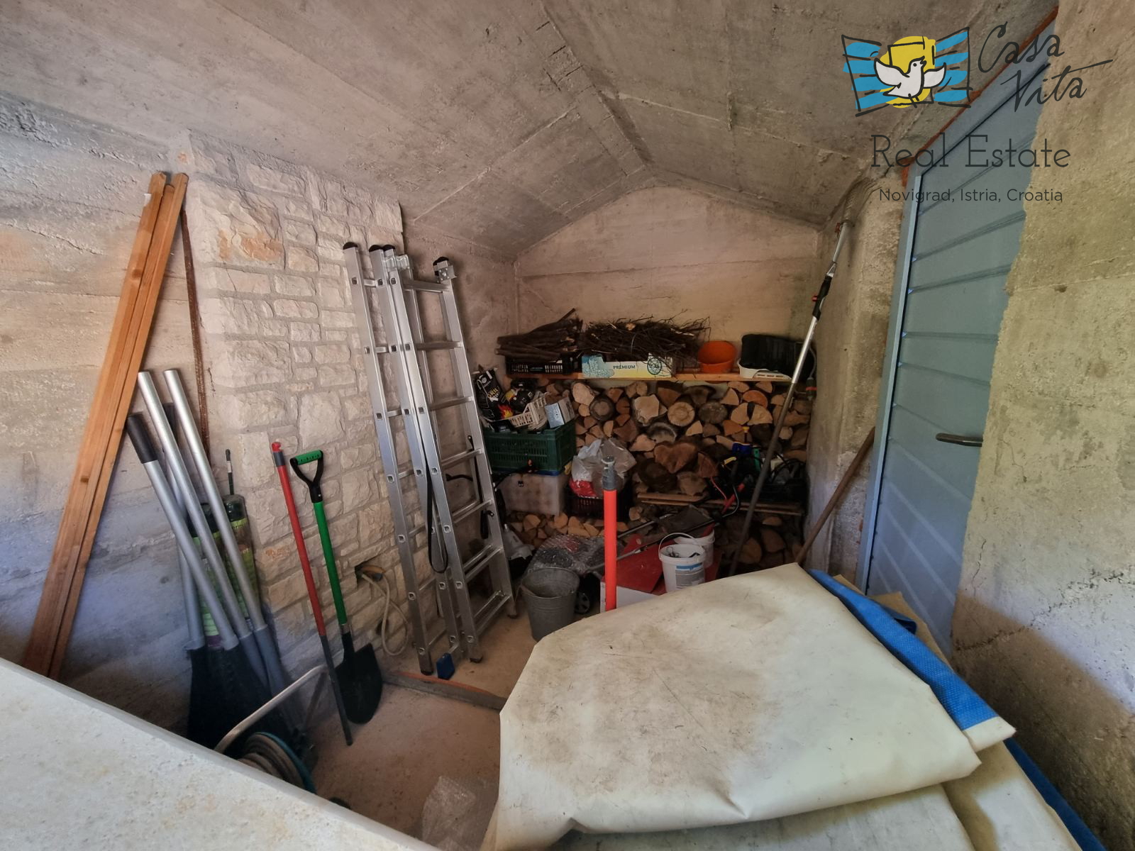 Prodaje se prekrasna dvojna kuća nalazi se na mirnoj lokaciji nedaleko od Poreča i svega 1 km od mora. Sagrađena je 2006. godine, a vlasnici su je renovirali 2021. godine, te ju kontinuirano održavaju. Kupili su je i koristili isključivo za svoje potrebe, kuća nije nikada iznajmljivana! Ukupno ima 155,55 m2 sa terasama (135 m2 zatvorenog prostora), na parceli od 367 m2. Vrta ima 200 m2. Kuća se sastoji od prizemlja i kata, mediteransko-rustikalnog je stila. U prizemlju se nalaze hodnik, spavaća soba, kupaona, veliki dnevni boravak sa kaminom i kuhinja sa blagovanom. Iz dnevnog boravka i kuhinje izlazi se na natrkivenu terasu gdje se nalazi još jedan kamin i stol za ručavanje, te u vrt. Na katu se nalaze još dvije spavaće sobe svaka sa svojim kupatilom, koje dijele prostranu natkrivenu terasu. Terasa je vanjskim stubištem povezana sa vrtom. Vrt je prekrasno uređen sa mediteranskim biljkama, starom maslinom, uređenim travnjakom, te bazenom od 30 m2. Uz bazen je napravljena mala kamena vrtna kućica od 7 m2 gdje je predviđeno sve za saunu ili može služiti kao spremište. Uz bazen i kućicu se nalazi vanjski tuš. Kuća ima 2 parkirna mjesta. Cijeli vrt je zatvoren zidom, zelenilom ili metalnom ogradom. U stražnjem dijelu kuće, blizu bazena, nalazi se spremište/kotlovnica i ljetna kuhinja. Kuća se prodaje sa namještajem koji je izrađen za cijelu kuću po mjeri. Grijanje je regulirano centralno na lož ulje. Pokretna klima je instalirana samo u jednoj spavaćoj sobi. Instaliran je i alarm te video kamere. Kuća može biti odmah useljiva!