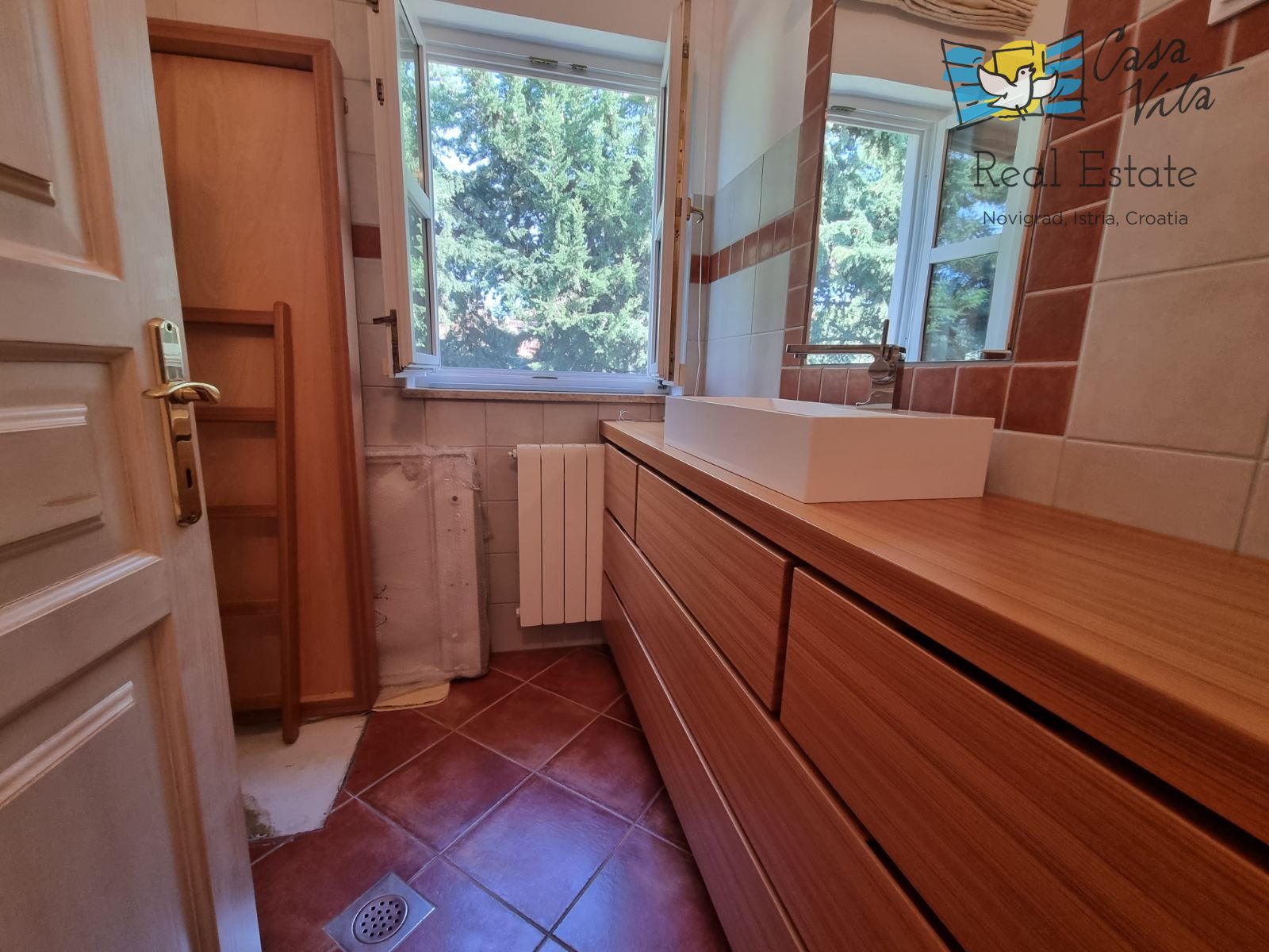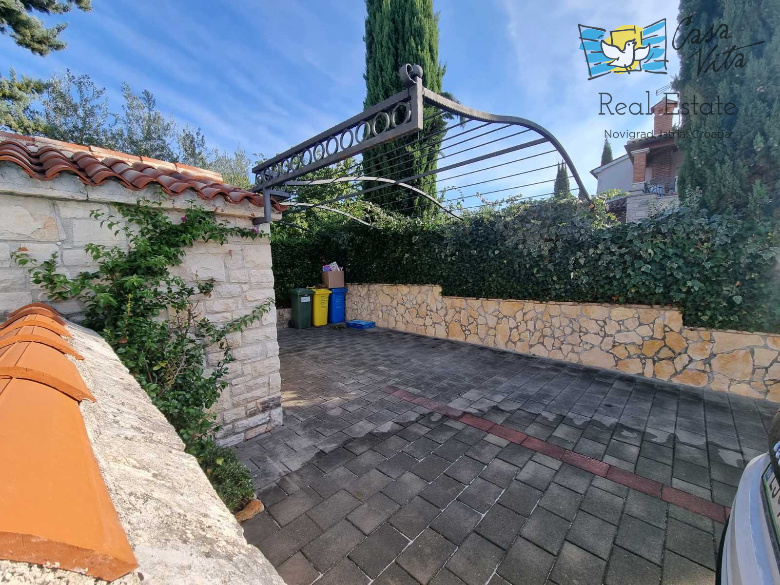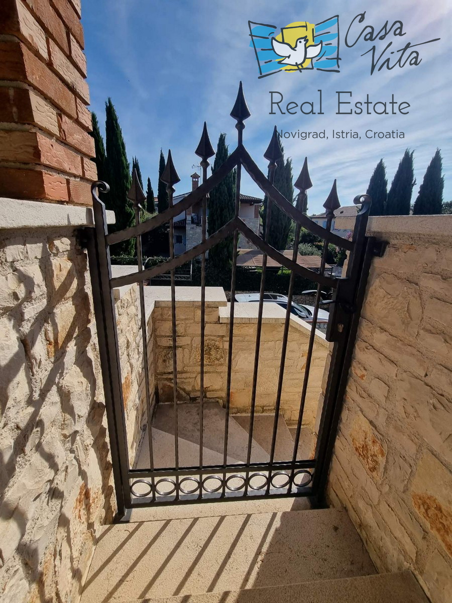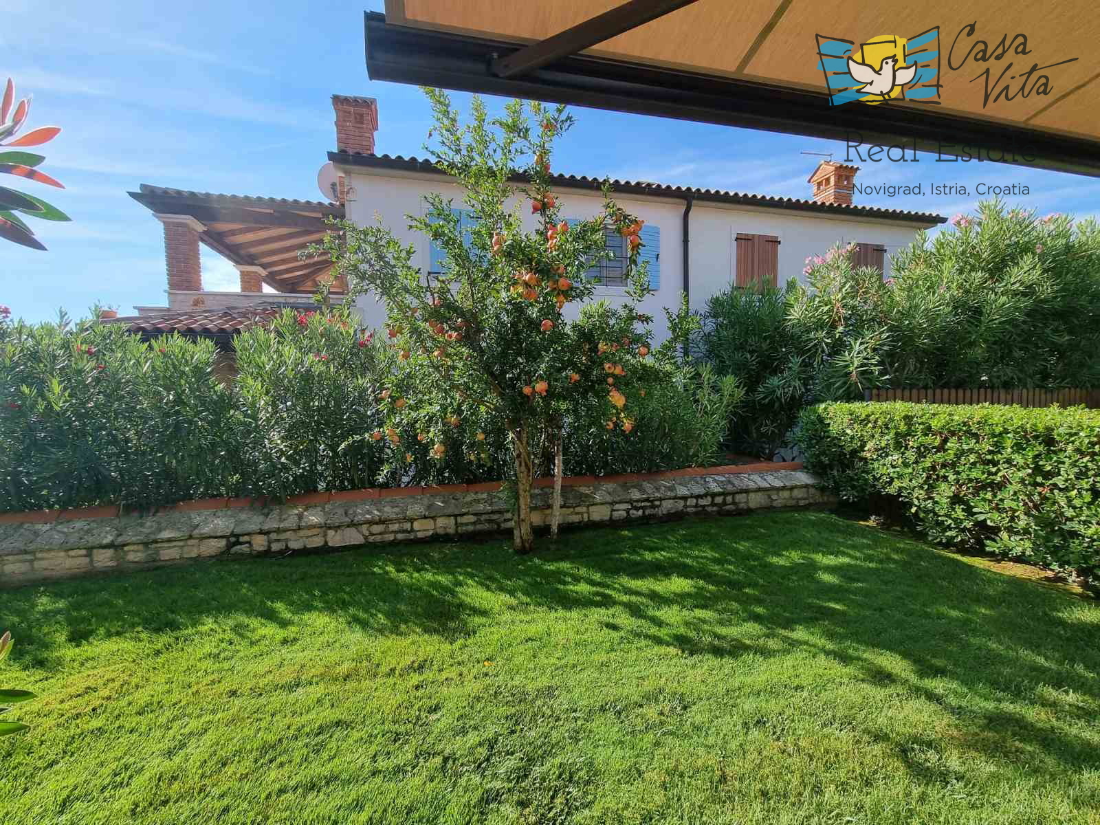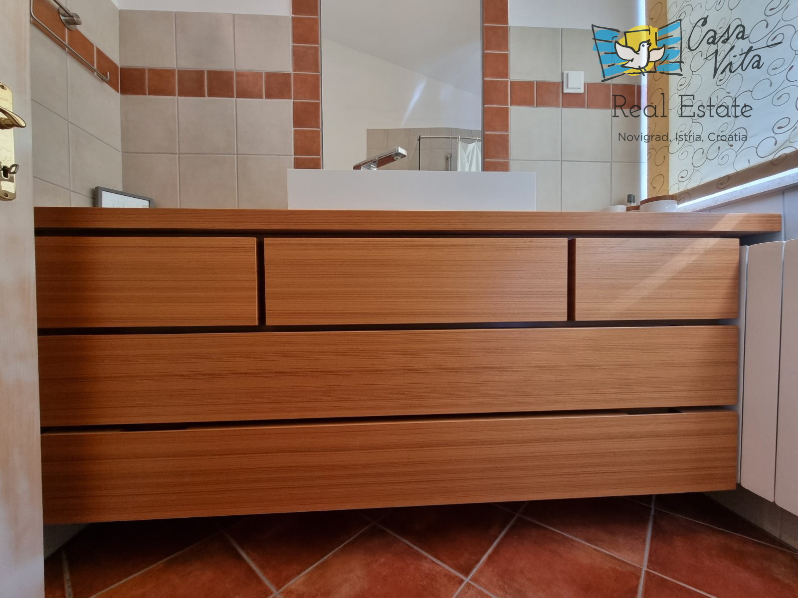 Prodaje se prekrasna dvojna kuća nalazi se na mirnoj lokaciji nedaleko od Poreča i svega 1 km od mora. Sagrađena je 2006. godine, a vlasnici su je renovirali 2021. godine, te ju kontinuirano održavaju. Kupili su je i koristili isključivo za svoje potrebe, kuća nije nikada iznajmljivana! Ukupno ima 155,55 m2 sa terasama (135 m2 zatvorenog prostora), na parceli od 367 m2. Vrta ima 200 m2. Kuća se sastoji od prizemlja i kata, mediteransko-rustikalnog je stila. U prizemlju se nalaze hodnik, spavaća soba, kupaona, veliki dnevni boravak sa kaminom i kuhinja sa blagovanom. Iz dnevnog boravka i kuhinje izlazi se na natrkivenu terasu gdje se nalazi još jedan kamin i stol za ručavanje, te u vrt. Na katu se nalaze još dvije spavaće sobe svaka sa svojim kupatilom, koje dijele prostranu natkrivenu terasu. Terasa je vanjskim stubištem povezana sa vrtom. Vrt je prekrasno uređen sa mediteranskim biljkama, starom maslinom, uređenim travnjakom, te bazenom od 30 m2. Uz bazen je napravljena mala kamena vrtna kućica od 7 m2 gdje je predviđeno sve za saunu ili može služiti kao spremište. Uz bazen i kućicu se nalazi vanjski tuš. Kuća ima 2 parkirna mjesta. Cijeli vrt je zatvoren zidom, zelenilom ili metalnom ogradom. U stražnjem dijelu kuće, blizu bazena, nalazi se spremište/kotlovnica i ljetna kuhinja. Kuća se prodaje sa namještajem koji je izrađen za cijelu kuću po mjeri. Grijanje je regulirano centralno na lož ulje. Pokretna klima je instalirana samo u jednoj spavaćoj sobi. Instaliran je i alarm te video kamere. Kuća može biti odmah useljiva!