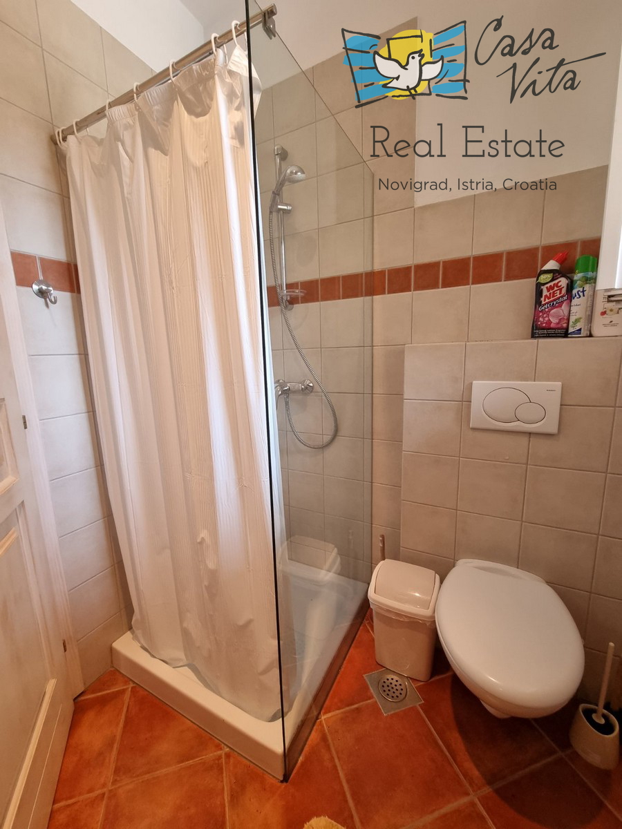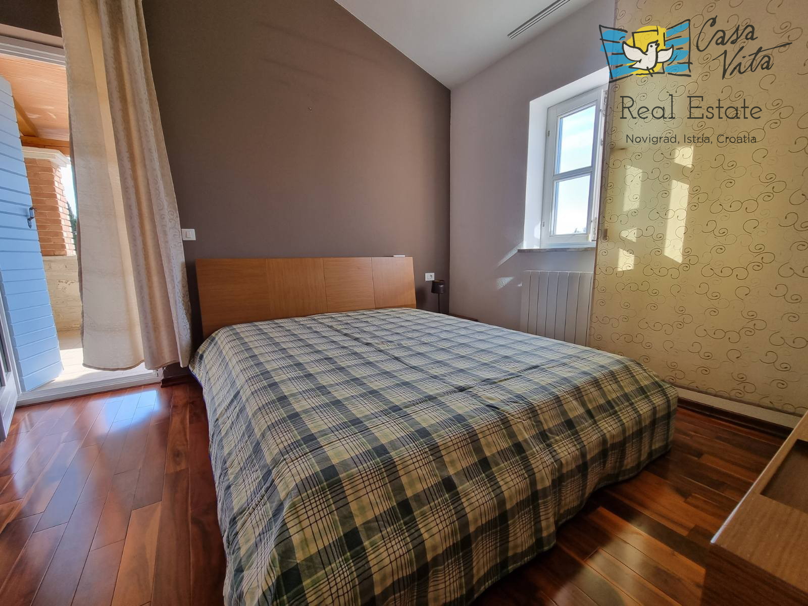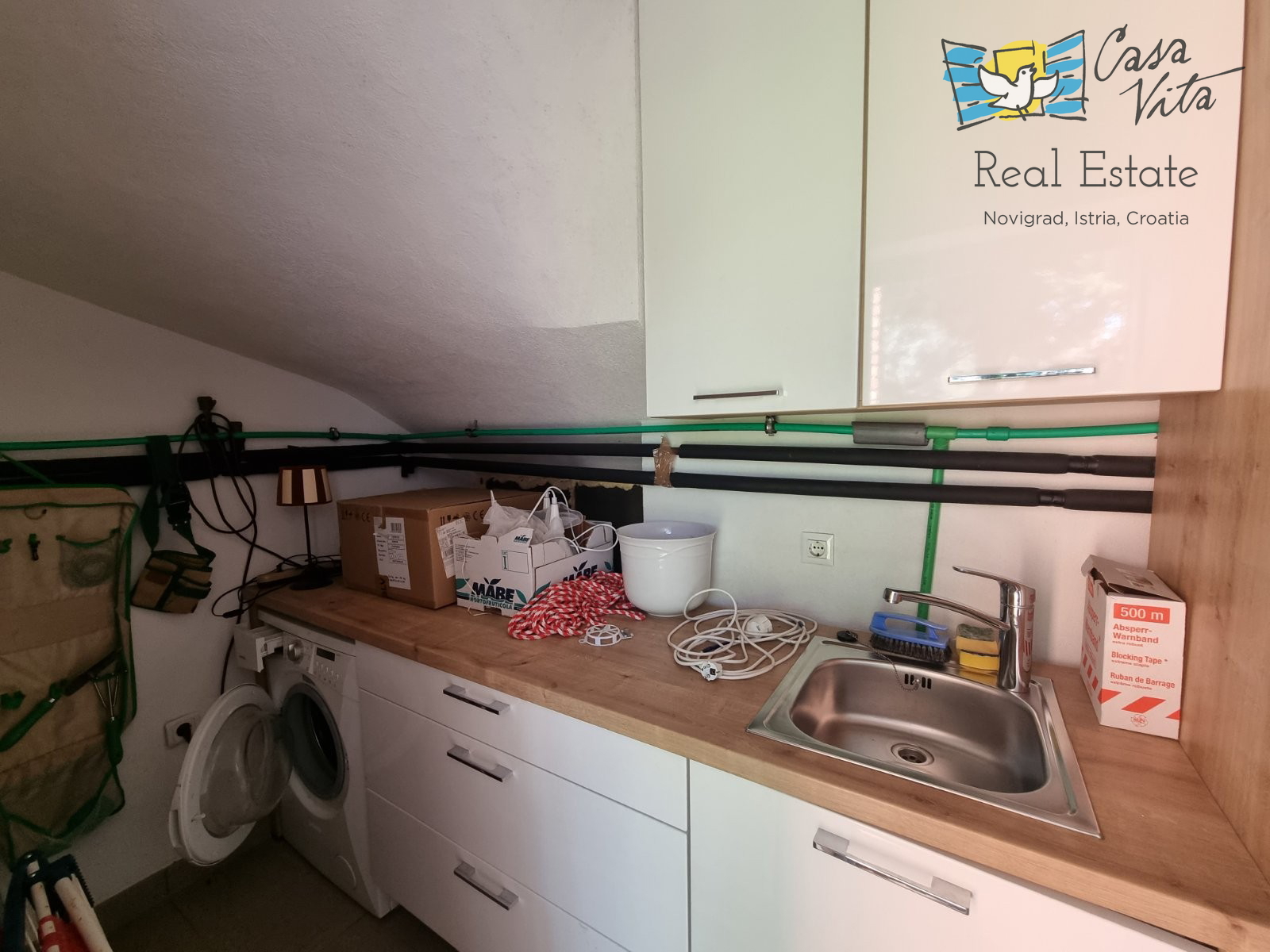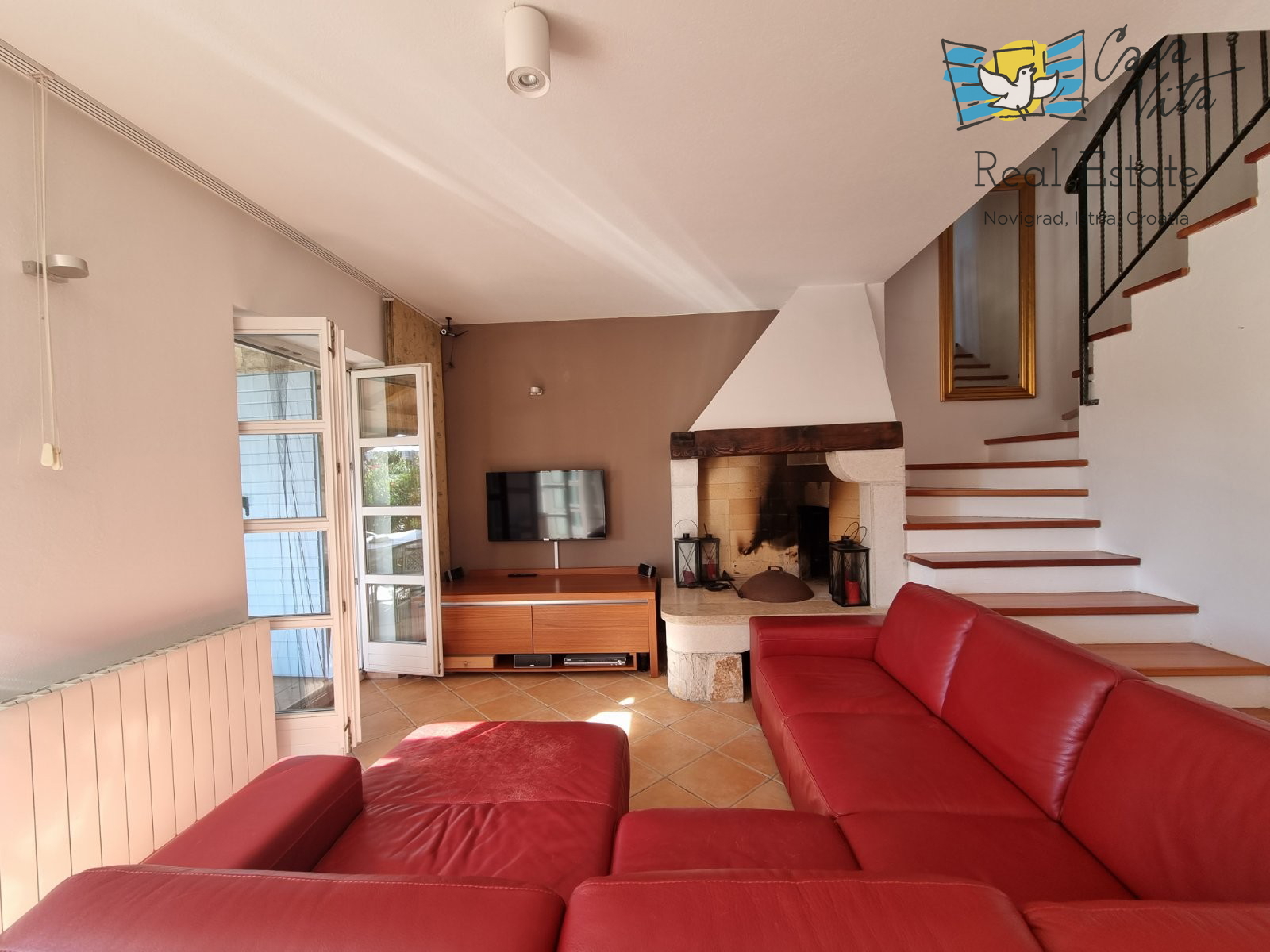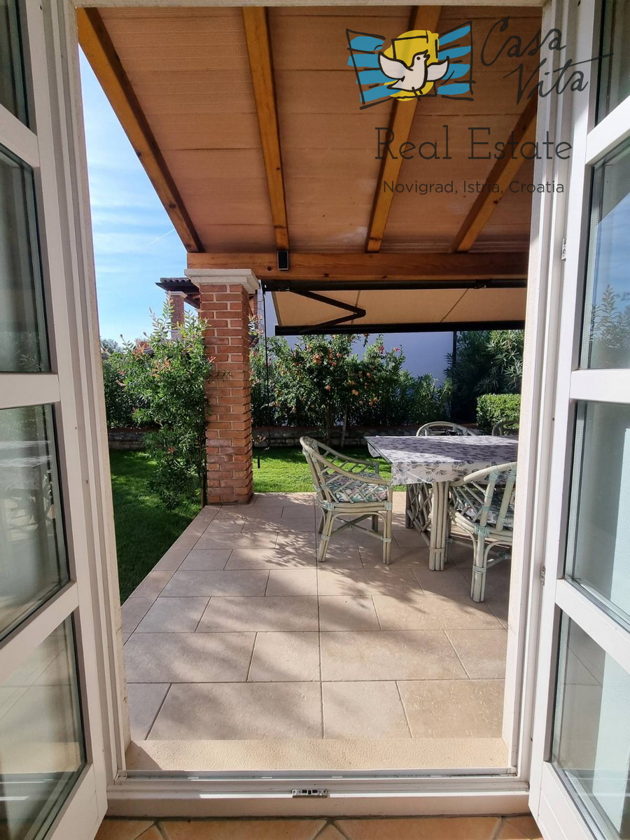 Prodaje se prekrasna dvojna kuća nalazi se na mirnoj lokaciji nedaleko od Poreča i svega 1 km od mora. Sagrađena je 2006. godine, a vlasnici su je renovirali 2021. godine, te ju kontinuirano održavaju. Kupili su je i koristili isključivo za svoje potrebe, kuća nije nikada iznajmljivana! Ukupno ima 155,55 m2 sa terasama (135 m2 zatvorenog prostora), na parceli od 367 m2. Vrta ima 200 m2. Kuća se sastoji od prizemlja i kata, mediteransko-rustikalnog je stila. U prizemlju se nalaze hodnik, spavaća soba, kupaona, veliki dnevni boravak sa kaminom i kuhinja sa blagovanom. Iz dnevnog boravka i kuhinje izlazi se na natrkivenu terasu gdje se nalazi još jedan kamin i stol za ručavanje, te u vrt. Na katu se nalaze još dvije spavaće sobe svaka sa svojim kupatilom, koje dijele prostranu natkrivenu terasu. Terasa je vanjskim stubištem povezana sa vrtom. Vrt je prekrasno uređen sa mediteranskim biljkama, starom maslinom, uređenim travnjakom, te bazenom od 30 m2. Uz bazen je napravljena mala kamena vrtna kućica od 7 m2 gdje je predviđeno sve za saunu ili može služiti kao spremište. Uz bazen i kućicu se nalazi vanjski tuš. Kuća ima 2 parkirna mjesta. Cijeli vrt je zatvoren zidom, zelenilom ili metalnom ogradom. U stražnjem dijelu kuće, blizu bazena, nalazi se spremište/kotlovnica i ljetna kuhinja. Kuća se prodaje sa namještajem koji je izrađen za cijelu kuću po mjeri. Grijanje je regulirano centralno na lož ulje. Pokretna klima je instalirana samo u jednoj spavaćoj sobi. Instaliran je i alarm te video kamere. Kuća može biti odmah useljiva!