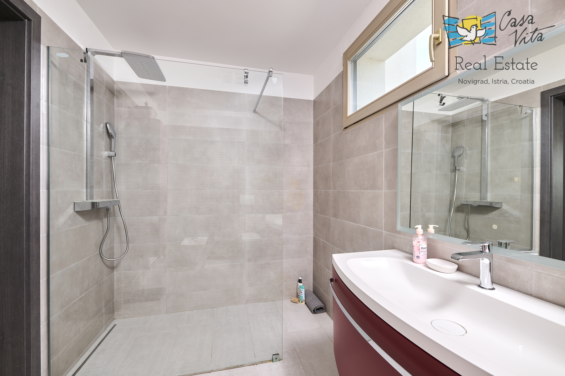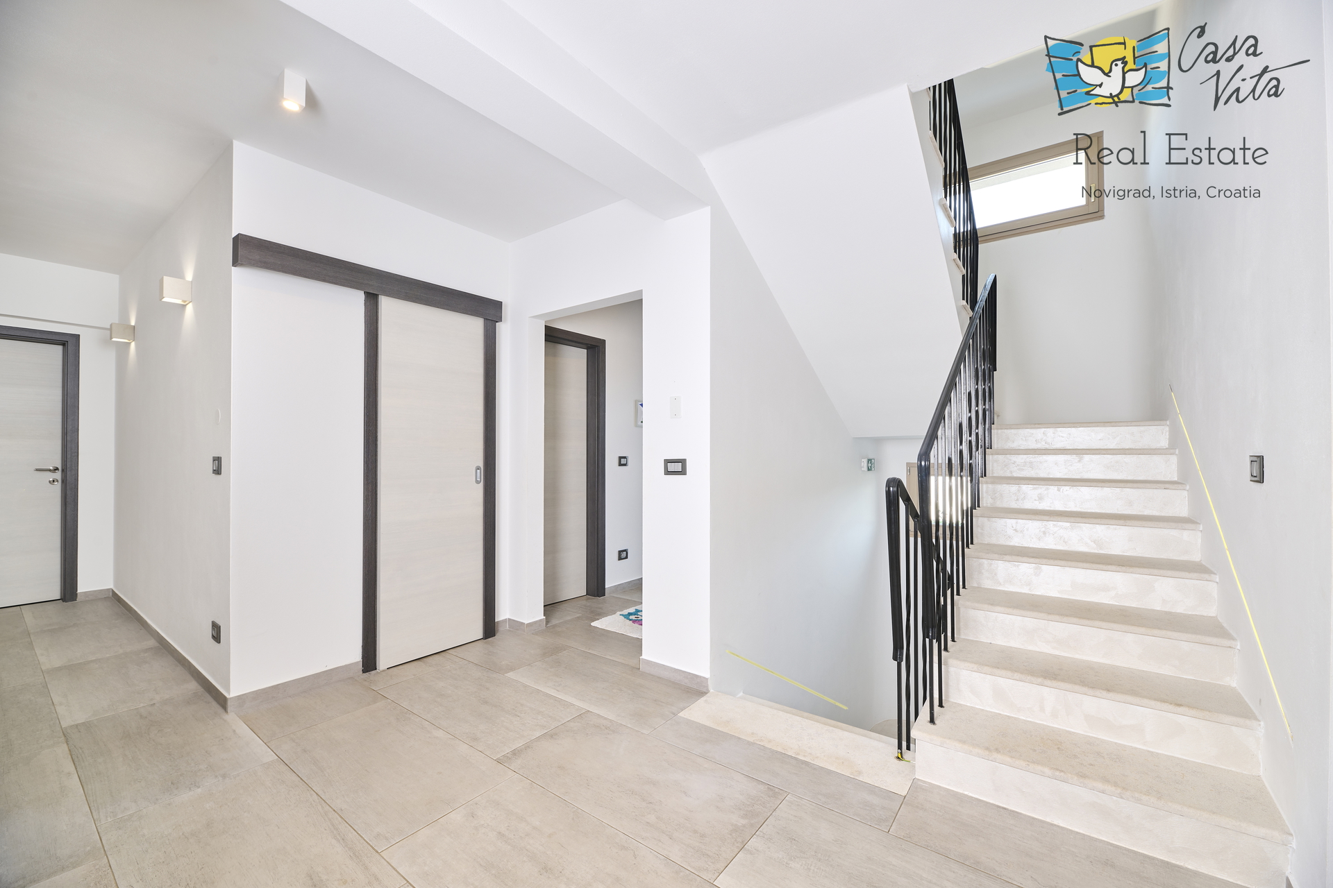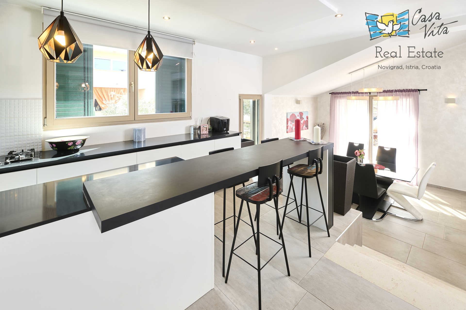 Nekretnina je projektirana i izgrađena kao obiteljska kuća kako bi pružila funkcionalan životni prostor za obitelj i prijatelje. Ukupno ima 380 m2, na parceli od 710 m2. Prizemlje je otvorenog tlocrta s kuhinjom koja vodi do blagovaonice i dnevnog boravka koji se ljeti otvaraju na vanjski dnevni boravak s blagovaonicom ispod natkrivene terase. Na ovom katu se nalazi i spavaća soba s kupaonicom (ensuite) te zaseban WC.