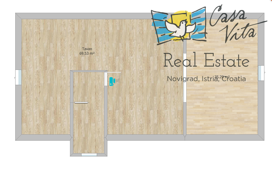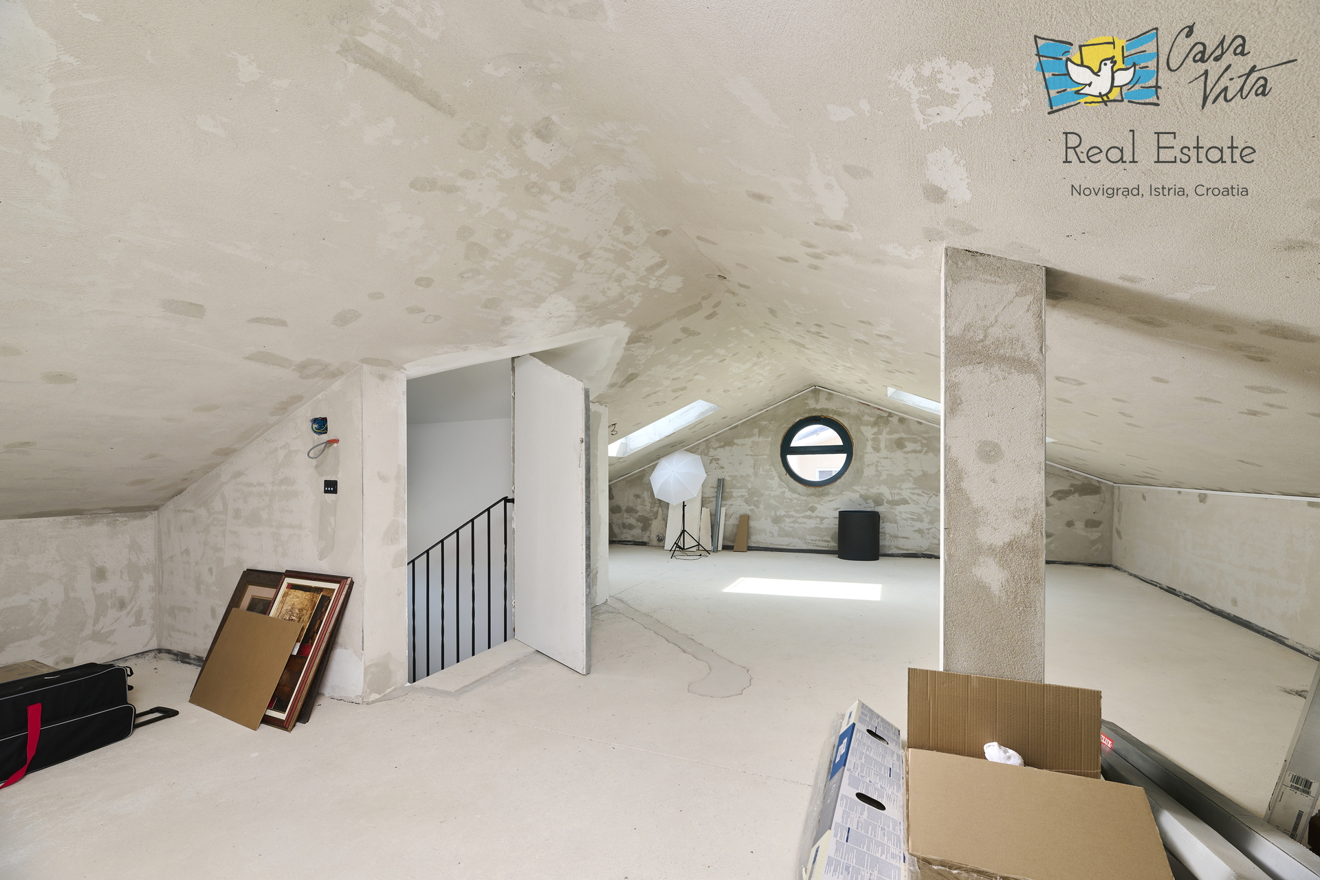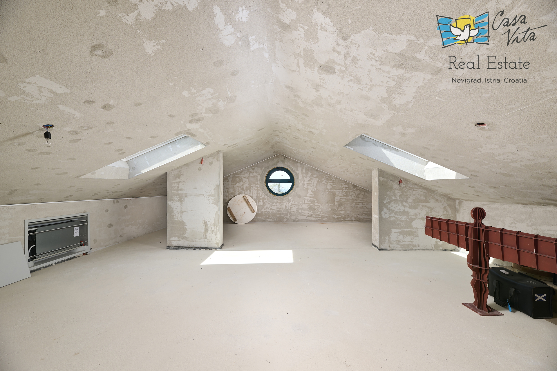 U potkrovlju se nalazi još nedovršeni prostor od 100 m2 sa svim električnim i vodovodnim instalacijama za stvaranje glavne spavaće sobe ili zasebnog stana. Ima 2 velux prozora i dva okrugla prozora od kojih jedan ima prekrasan pogled na Jadransko more.