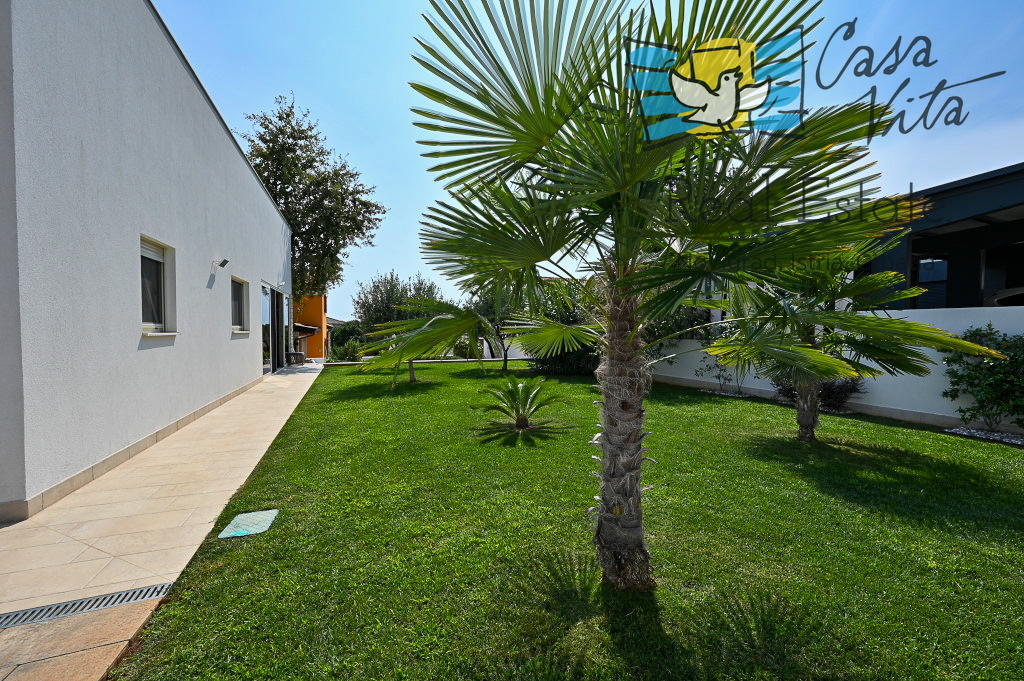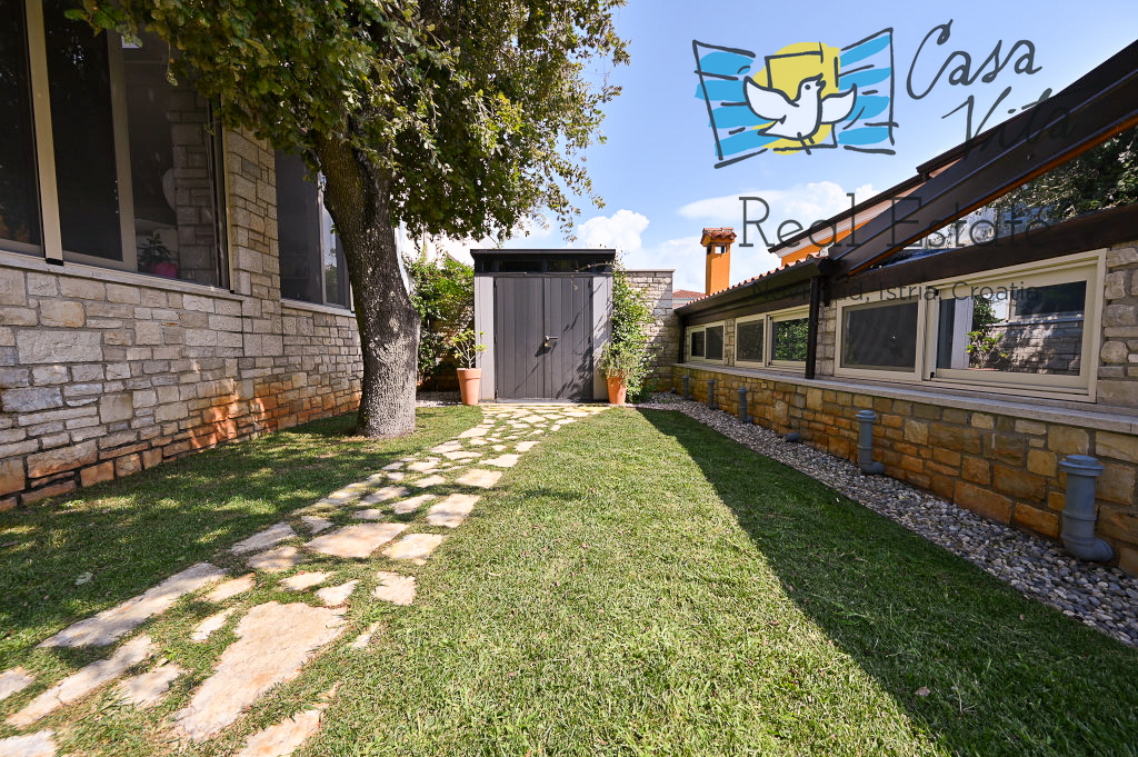Дом расположен на участке площадью 420 м2 и окружён ухоженным двором площадью 300 м2, который предоставляет дополнительное пространство для отдыха и пребывания на свежем воздухе. Внутреннее пространство дома характеризуется одной просторной спальней, кухней, гостиной, большой ванной комнатой и полностью закрытой террасой с биоперголой и атриумом, что обеспечивает естественное освещение и ощущение простора в течение всего дня. Особую ценность представляет летняя кухня, идеально подходящая для встреч и отдыха на свежем воздухе, а также садовый домик.