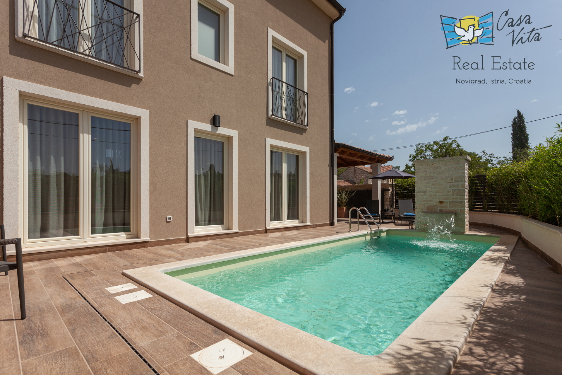 Dnevna soba vodi neposredno na vrt, kjer je bazen, sončna terasa in pokrita terasa z žarom.
