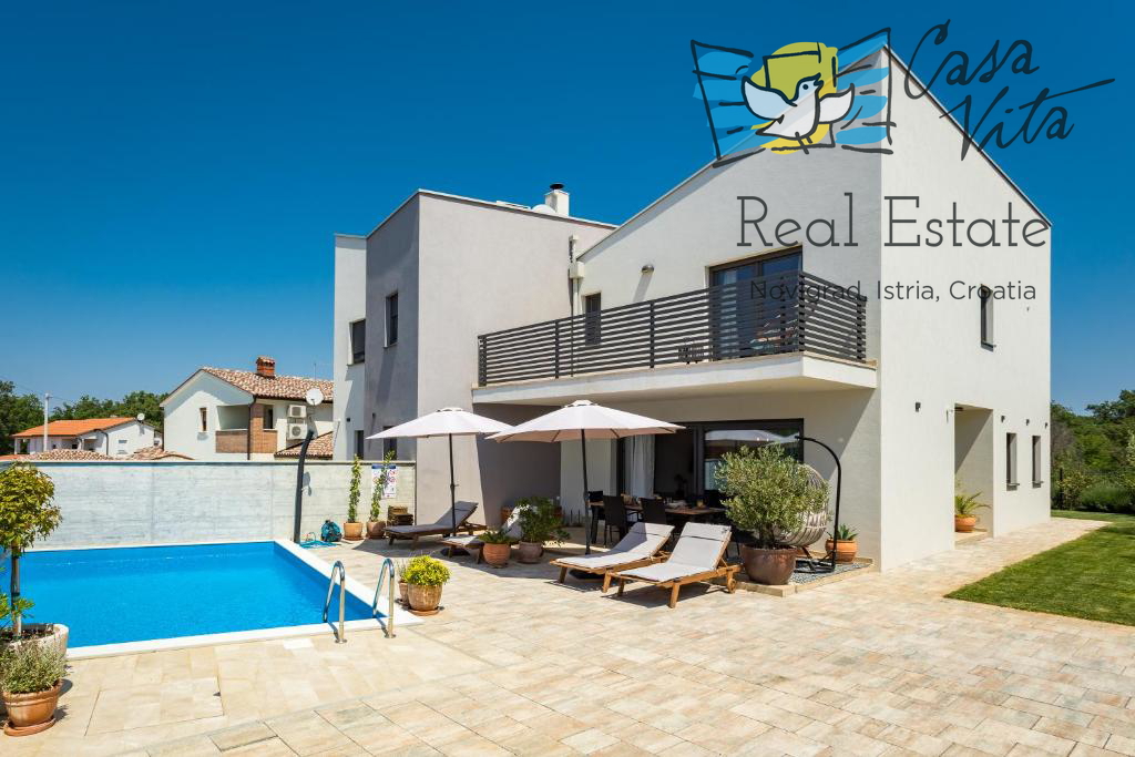 Prodaja se dvojna hiša v mirni soseski blizu Poreča, zgrajena leta 2020, površine 130 m2, nameščena na parceli velikosti 300 m2.